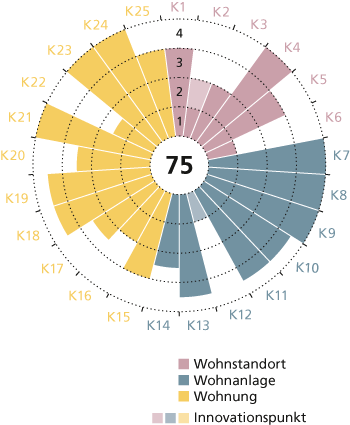 Der Grundriss ist so konzipiert, dass auch in Ecksituationen gegenseitige Einsichten verhindert werden können. Die meisten Wohnungen orientieren sich nach drei Richtungen. Die Häuser werden zentral erschlossen und haben je zwei, in den Regelgeschossen dreibündige Treppenhäuser und einladende Eingangshallen, welche auch für soziale Anlässe benötigt werden können und so die nicht vorhandenen Gemeinschaftsräume kompensieren. Die relativ gute Möblierbarkeit der Genossenschaftswohnungen wird nur dadurch eingeschränkt, dass nicht alle Zimmer die Mindestbreite von 3 m einhalten. Vier Mansardenzimmer mit eigenen sanitären Anlagen ergänzen die Wohnungen. Die einheitliche Gestaltung der Fassaden bindet die zwei Gebäude zusammen, die horizontale Gliederung der Fassaden schafft Massstäblichkeit.