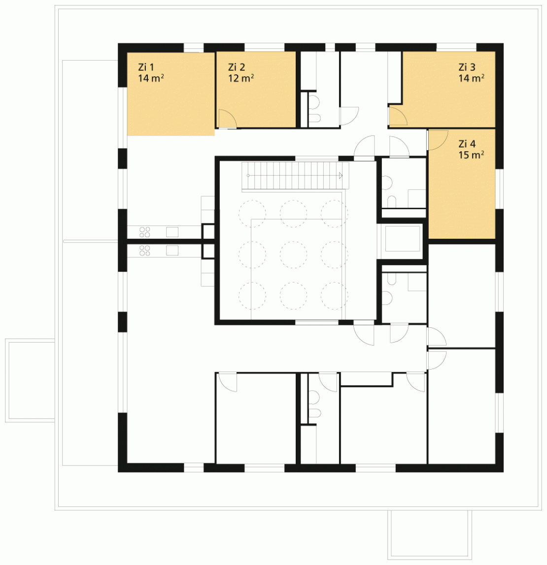 Zimmer sind nutzungsneutral. Als Zimmer gelten gemeinsame Aufenthaltsbereiche wie offene Wohnbereiche mit angegliedertem Kochbereich oder individuell genutzte und abschliessbare Aufenthaltsbereiche wie Arbeits- oder Schlafräume. Zimmer sind natürlich belichtet, belüftet und beheizt. Das erste Zimmer einer Wohnung weist mindestens 14 m2 auf. Alle weiteren Zimmer sind mindestens 10 m2 gross, sofern kantonale Bestimmungen nicht kleinere Zimmer zulassen. Zur Bestimmung der Grösse der Wohnung (z. B. 4-Zimmer) werden die Zimmer gezählt. Halbe Zimmer können für die Bestimmung nicht mitgerechnet werden, da diese als Essbereich und/oder zusätzliches Flächenangebot berücksichtigt werden.