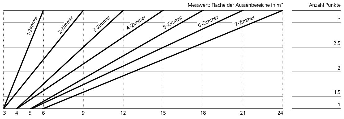 Beim privaten Aussenbereich wird die begeh- oder bepflanzbare Fläche aller eindeutig zur Wohnung gehörenden Aussenbereiche quantitativ beurteilt. Nicht angerechnet werden dabei die Flächen von K5/Grossflächiges Freiraumangebot sowie K8/Gemeinsamer Aussenbereich. Direkt an die Wohnung angrenzende Flächen wie Balkone, Terrassen, Loggien, Zwischenzonen und Gärten werden voll angerechnet. Halb angerechnet werden nicht direkt angrenzende, aber bequem erreichbare und eindeutig der Wohnung zugeordnete Aussenbereiche wie Nutz- oder Dachgärten.