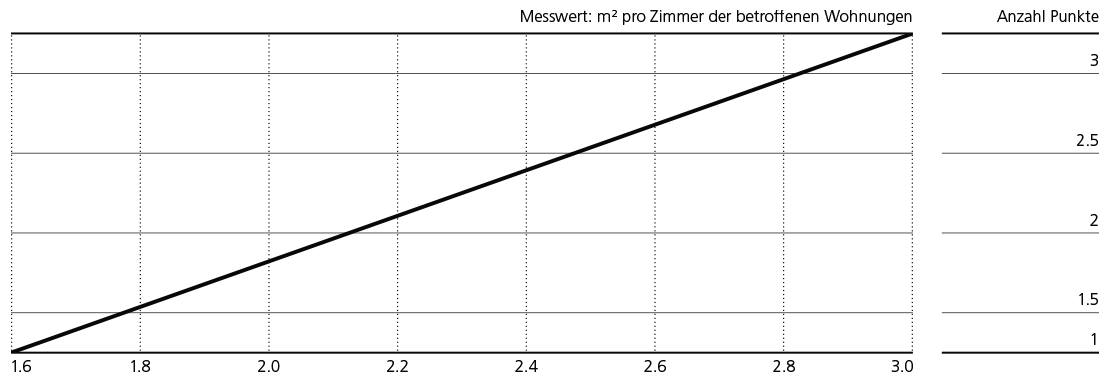 Das Kriterium wird anhand der Fläche aller zur Wohnung gehörenden privaten Abstellräume ausserhalb der Wohnung, abzüglich der Erschliessungszone in der Wohnanlage, quantitativ beurteilt. Die privaten Abstellräume ausserhalb der Wohnung müssen mindestens 140 cm breit sein. Die Gesamtfläche wird durch die Gesamtzimmerzahl der betroffenen Wohnungen geteilt. Liegen die privaten Abstellräume ausserhalb des Hauptgebäudes und mehr als 25 m vom Hauseingang entfernt, können die Flächen zur Hälfte angerechnet werden. Ergänzend zur Quantität können bei Qualität und Innovation Punkte angerechnet werden.