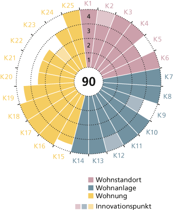Die ergänzenden Nutzungen im Bereich Wohnstandort sind sehr vielfältig und greifen stark in die umliegenden Quartiere. Das fein austarierte System an ergänzenden Nutzungen wird den verschiedenen Öffentlichkeitsgraden gerecht und kann je nach Funktion von unterschiedlichen Nutzergemein schaften oder Personen belegt werden. Diese Aspekte sowie die flexiblen Wohnformen werden mit Innovationspunkten gewürdigt. Als weitere Innovation wird die Autoverzichtserklärung der Bewohnerschaft während der Mietdauer gewertet. Die Kalkbreite ist mit ÖV bestens erschlossen, zudem werden über Mobilitätsfonds unpersönliche Abonnemente zur Verfügung gestellt. Die VeloInfrastruktur ist für eine intensive Nutzung ausgebaut. Zur Erhebung des Verkehrsverhaltens dient ein Monitoring. Im Bereich Wohnanlage werden die unterschiedlichen öffentlichen Mehrzweck- und Gemeinschaftsräume gewürdigt. Erwähnenswert ist beispielsweise das vielfältiges Angebot an Küchen: Gartenküche, Cafeteria mit Küche, Grosshaushaltsküche mit Köchin. Weiter wird der Umgang mit dem öffentlichen und privaten Aussenraum als Innovation hervorgehoben. Die meisten Wohnungen besitzen zwar keinen privaten Aussenraum. Als Kompensation dient, neben dem Stadtraum, die grosszügige Dachterrasse, die teilweise öffentlich zugänglich und nutzbar ist. Dieser Umgang mit Aussenräumen im städtischen Kontext erscheint mutig und sorgt für eine interessante Durchmischung von Nutzungen und Sozialräumen.