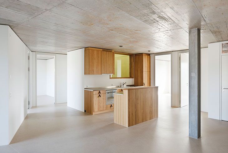 Eine Erschliessungskaskade verbindet Innen und Aussen sowie die begehbaren Dächer und Terrassen über der Tramhalle. Die Kalkbreite bietet vorwiegend innovative und flexible Wohnformen.