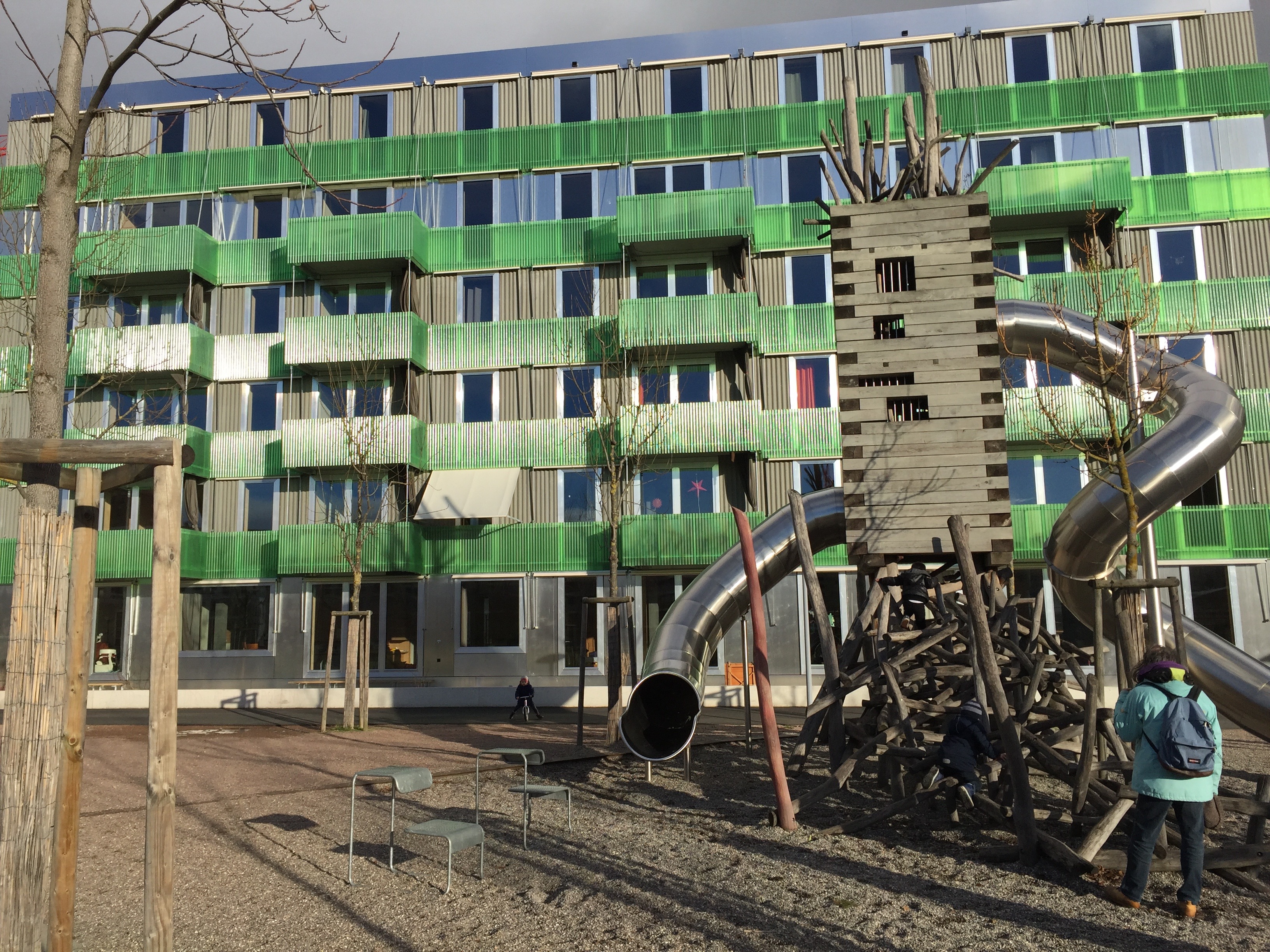 Das Gebäude am Goldbachweg 8 im neu entstandenen Areal Erlenmatt Ost ist das erste Projekt der 2013 gegründeten Wohngenossenschaft Zimmerfrei, die für die Realisierung mit Mietern und Genossenschaftern zusammenarbeitete und sich zum Ziel gemacht hat, bezahlbare Wohnungen für Menschen verschiedenster städtischer Lebensweisen und Lebensphasen zu schaffen. So gibt es in dem Haus mit den grünen wellenförmigen Scobalitplatten sowohl eine Wohnung in der Grösse eines Studios, als auch eine Wohnung mit 16 ½ Zimmern, die auf einer Fläche von 347 m2 als Cluster-Wohnung betrieben wird. Die Kosten konnten durch die Wahl von langlebigen Industriematerialien für die mehrschichtige Fassade in Zaum gehalten werden.