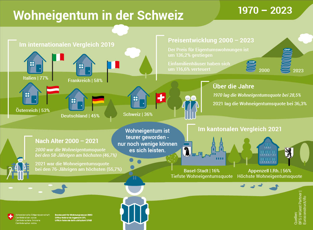 Wie entwickelt sich das Wohneigentum in der Schweiz? Für wen ist Wohneigentum heute noch erschwinglich? Wo leben die meisten und wo die wenigsten Wohneigentümer? Und in welcher Altersgruppe kommt Wohneigentum am häufigsten vor? Die neue Infografik des BWO zeigt den aktuellen Stand des Wohneigentums. Sie zeigt zudem Daten über die Jahre sowie Daten im Vergleich zu den Nachbarländern.