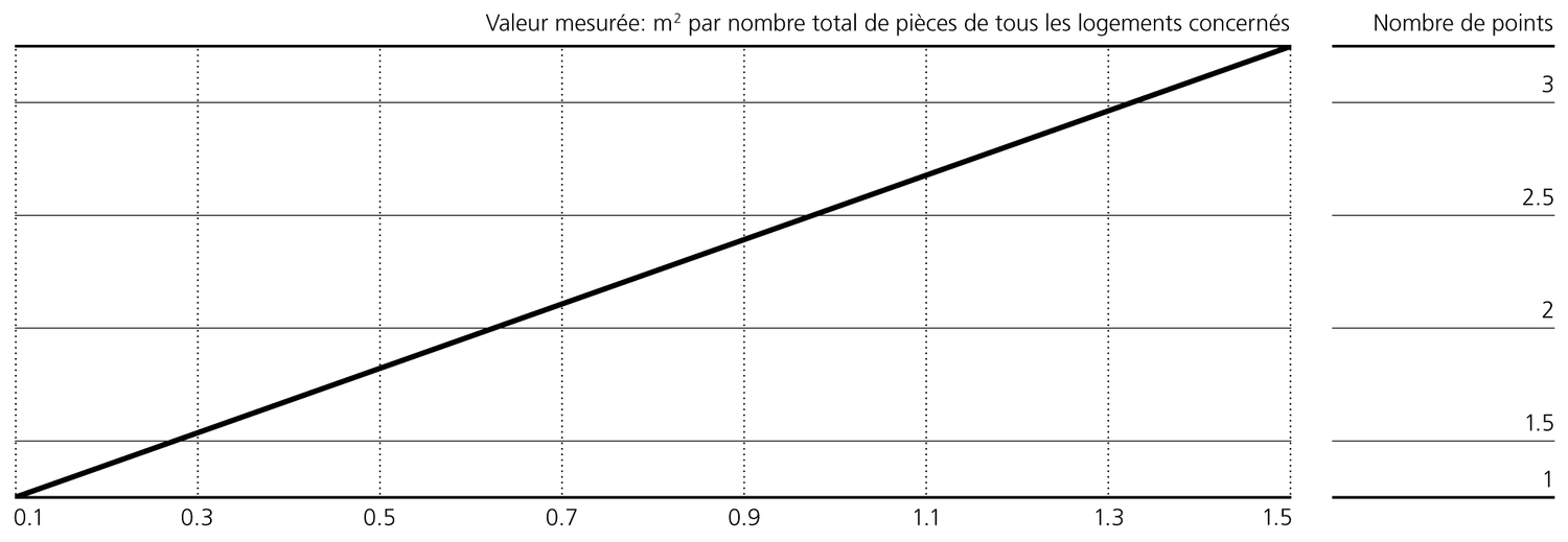 Les locaux polyvalents et communautaires du lotissement sont quantifiés par rapport à la surface totale de l'’ensemble des locaux équipés, pouvant être spécifiquement attribués. Ces locaux sont chauffés, naturellement éclairés et ventilés et offrent une surface minimale de 14 m². Si les locaux ne sont pas naturellement éclairés et ventilés, donc non destinés au séjour, mais par exemple utilisables comme atelier, les surfaces correspondantes seront comptées pour moitié. La surface totale est ensuite divisée par la somme des pièces de tous les logements concernés. Toutes les surfaces décomptées sous C12 sont à la disposition de tous les habitants et ne sont, contrairement à celles répertoriées sous C14/Disponibilité d’espaces modulables, que temporairement louées à des particuliers.