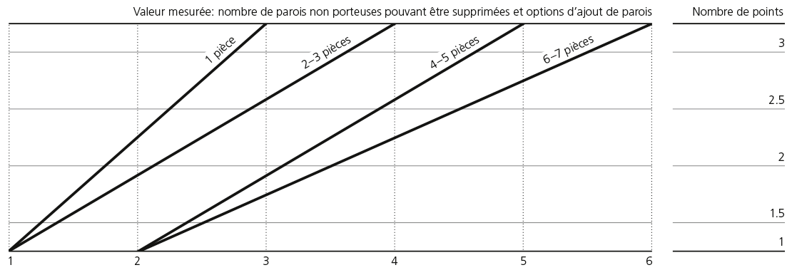 L’adaptabilité est évaluée qualitativement en fonction du nombre de parois non porteuses pouvant être supprimées et/ou de la possibilité d’en rajouter. Ces parois doivent pouvoir être supprimées ou ajoutées sans difficultés dues à la construction ou aux installations techniques et présenter une longueur minimale de 250 cm.Chaque nouvelle pièce ou partie de pièce ainsi créée doit être desservie indépendamment, offrir une surface d’au moins 10 m², au moins 270 cm sur son plus petit côté et être naturellement éclairée et ventilée. Les équipements de base doivent également être préservés dans le logement modifié. Toutes les parois non porteuses pouvant être supprimées et/ou rajoutées doivent figurer sur les plans.