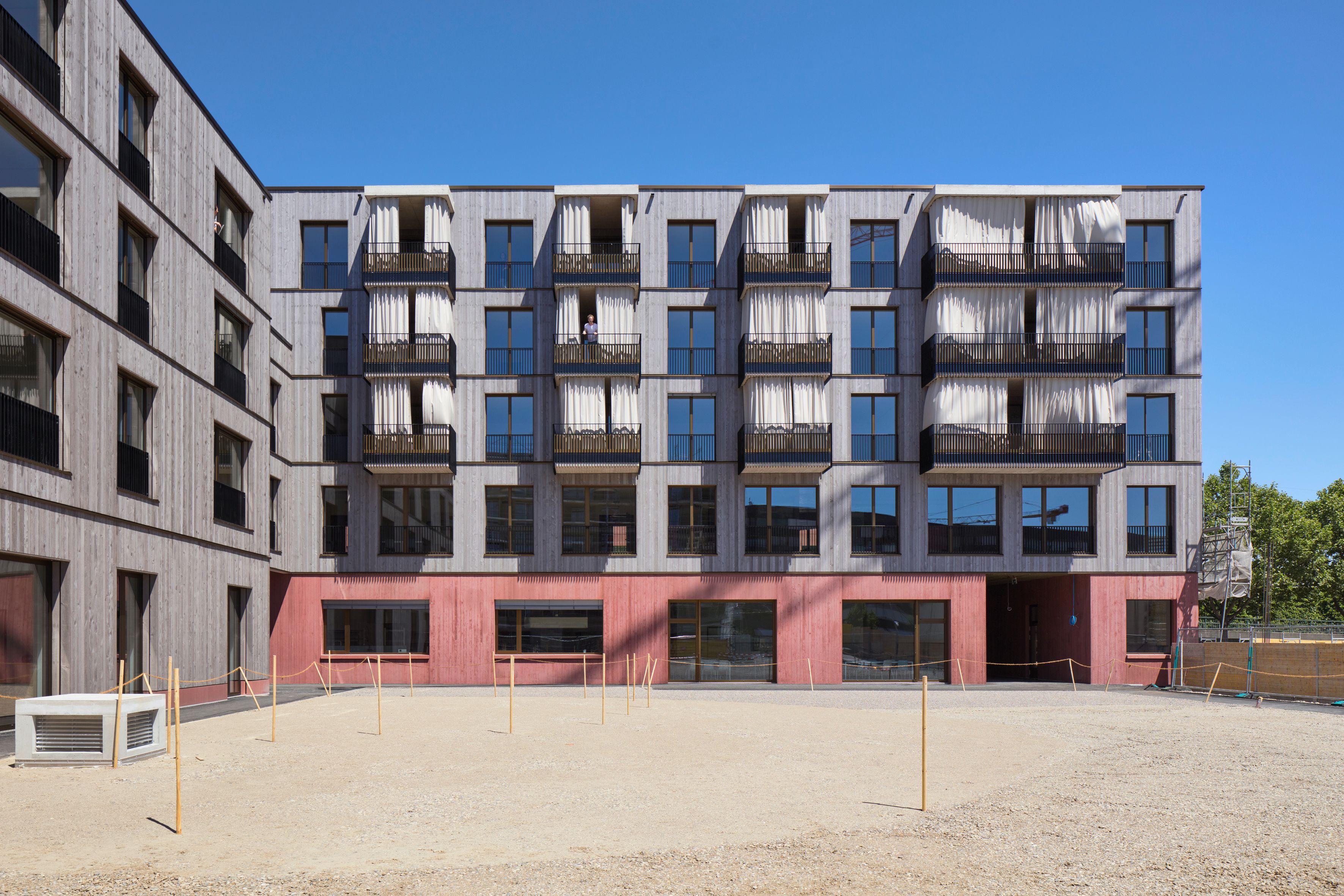 Le bâtiment en béton rouge se trouve dans Erlenmatt Est, en bordure de ce nouveau quartier résidentiel hétérogène. La Fondation Habitat a fait ériger cet immeuble pour en faire un lieu de vie et de travail. Des emplois sont également offerts à des personnes handicapées, qui collectent là où les résidents le souhaitent les déchets triés, nettoient le périmètre et exploitent une cuisine au rez-de-chaussée pour leurs propres besoins. L’immeuble abrite également une crèche.