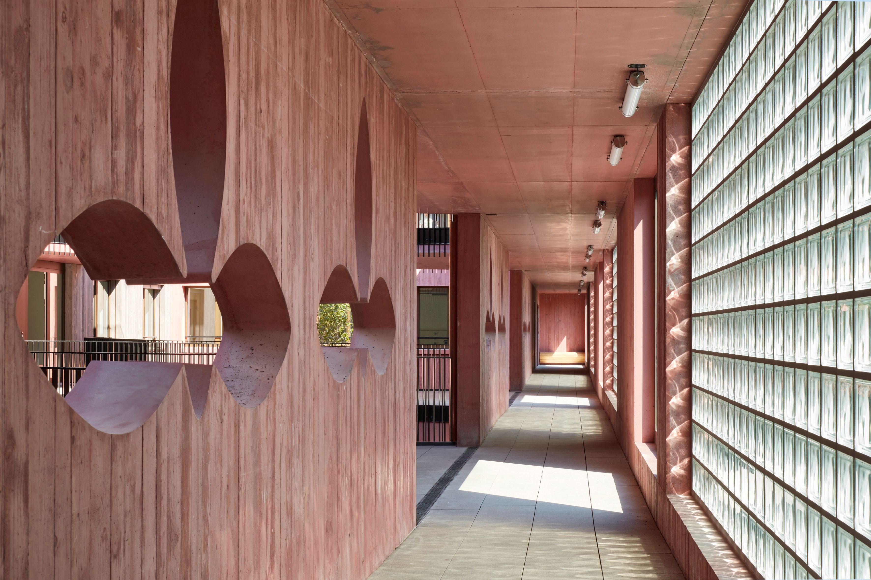 La fondation a réussi à rendre la vie quotidienne agréable à proximité d’une autoroute très fréquentée. Les espaces commerciaux du rez-de-chaussée et la façade en béton et en briques de verre protègent du bruit les appartements et la cour. Les zones de rencontre spacieuses aux différents étages offrent une vue sur les trois atriums, dont deux sont agrémentés par un arbre. Les résidents de l’immeuble ont également la possibilité de participer à l’aménagement des espaces semi-publics en installant leur propre mobilier.
