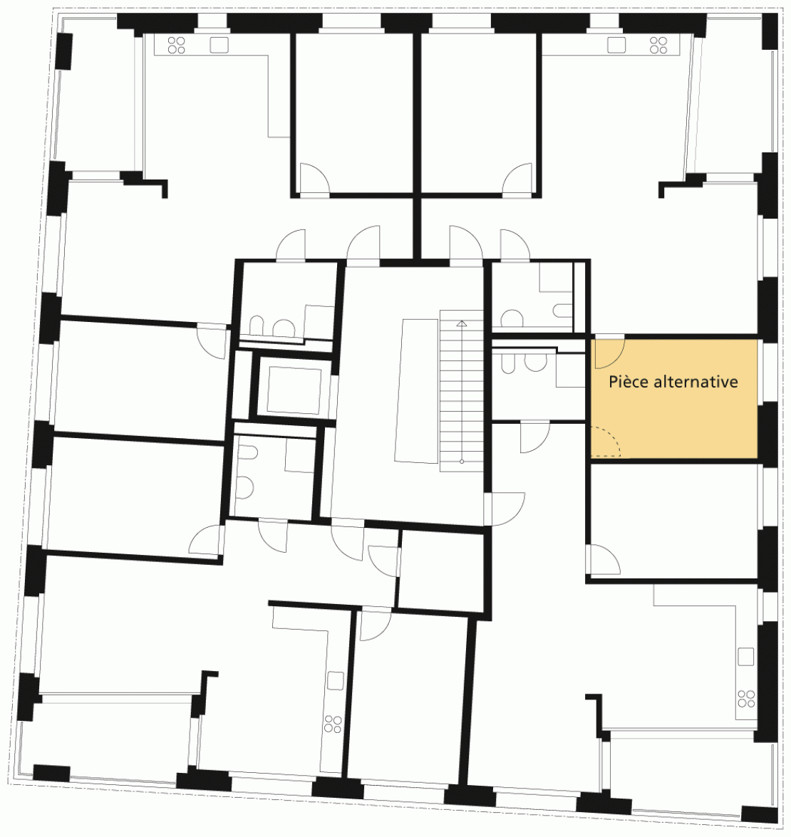 Les pièces alternatives répondent aux mêmes exigences qu’une pièce, mais ne sont pas rattachées à un mais à plusieurs logements. Une pièce alternative est toujours directement accessible depuis un logement adjacent et non par une surface de circulation semi- privée. Pour déterminer le nombre total de pièces, les pièces alternatives doivent être attribuées à un logement.
