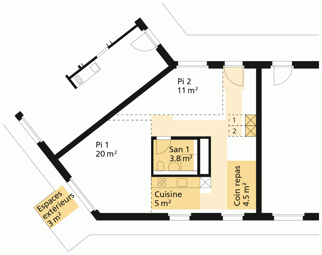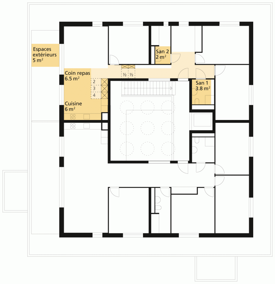 A côté des pièces sans distinction d’affectation, des zones d’utilisation sont définies à l’intérieur du logement. Voir également à ce propos le tableau des équipements de base.