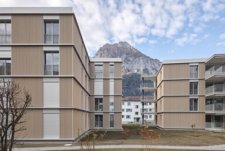Le lotissement «Grüne Buchten» comprend 48 logements de la coopérative d’habitation Pro Familia. La conception des bâtiments, faite de ruptures, donne l’impression de corps de bâtiment plus petits qui s’imbriquent les uns dans les autres. La forme coudée des bâtiments et leur léger décalage par rapport à l’axe nord-sud offrent au lotissement et à son voisinage un espace extérieur et des zones intermédiaires attrayants et ouverts sur le reste du quartier.