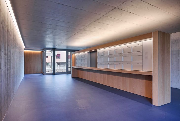 Le plan au sol a été conçu de manière à éviter les dispositions en vis-à-vis, y compris dans les angles. La plupart des logements s’orientent dans trois directions différentes. Les entrées des immeubles sont situées en leur centre; ils ont deux cages d’escalier, qui s’ouvrent, aux étages intermédiaires sur trois logements situés chacun sur l’un des côtés de la cage. Les halls d’entrée sont accueillants et peuvent être utilisés pour des activités sociales, ce qui compense l’absence de locaux communs. Les logements peuvent être relativement facilement meublés hormis le fait que certaines pièces comptent moins de 3 m de large. Quatre chambres mansardées disposant d’installations sanitaires indépendantes complètent l’offre de logements. La conception uniforme des façades, dont l’articulation horizontale concourt à l’harmonie des proportions, unit les deux bâtiments.