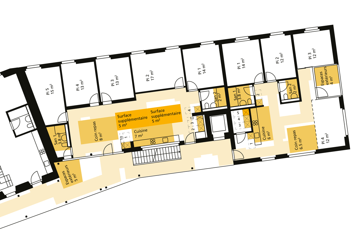 Les schémas montrent en partie la manière dont les surfaces sont reportées sur les plans pour préparer l’évaluation. Tout d’abord, les surfaces de circulation sont rattachées aux pièces correspondantes afin d’établir le nombre de pièces. Les différentes zones d’utilisation (cuisine, coin repas, etc.) sont ensuite identifiées afin de déterminer s’il existe une offre de surfaces supplémentaires susceptibles de fonctionner comme des demi-pièces et de rapporter des points additionnels pour de nombreux critères.