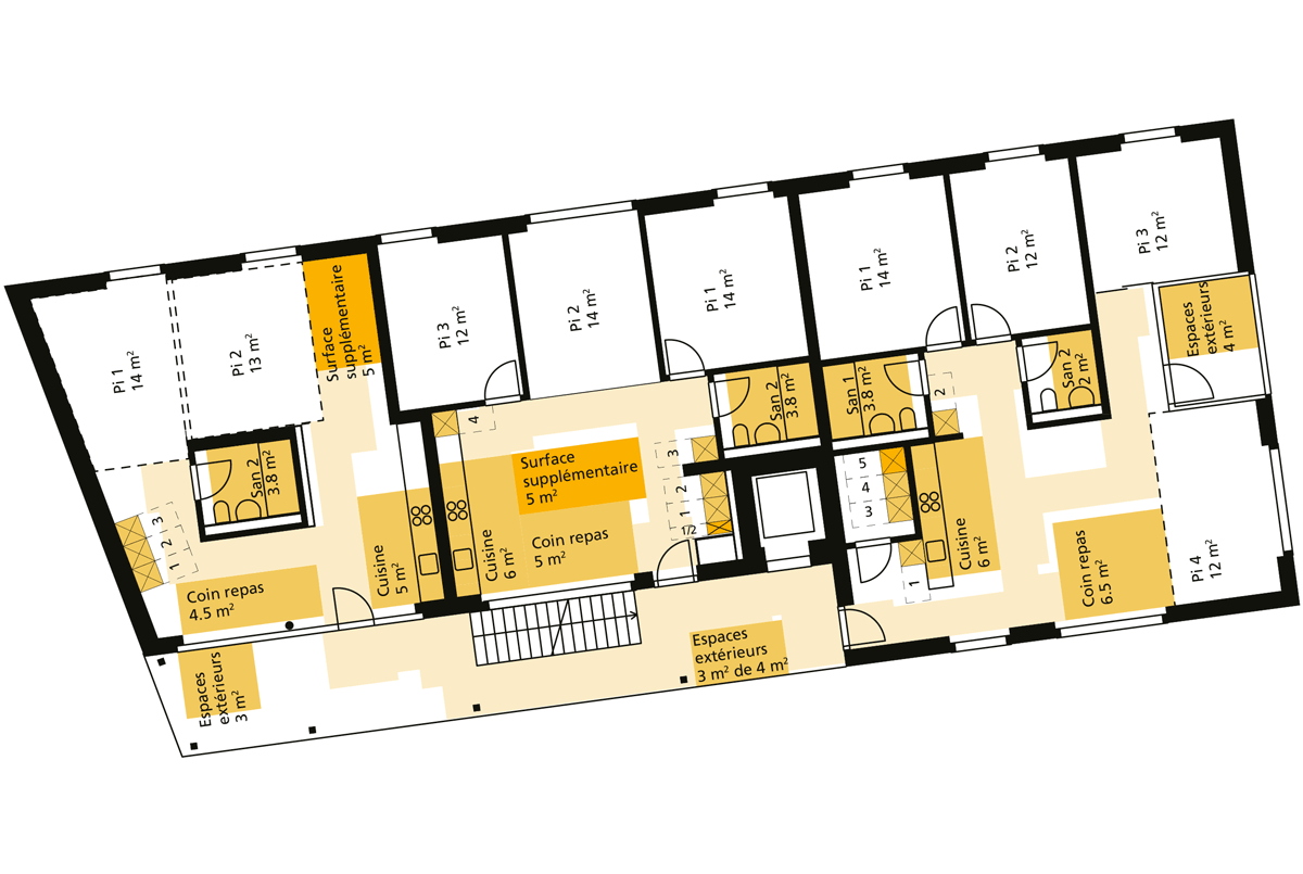 Les types de logements sont diversifiés de manière à favoriser la mixité sociale. Ils vont du logement une pièce pour les petits ménages au six-pièces pour les familles, et de l’appartement conçu pour de grandes colocations au logement regroupé (« cluster »). Simplicité et modération sont les maîtres mots de ce projet, en accord avec le charme industriel qui se dégage du lieu et le principe d’autosuffisance. Les matériaux choisis sont robustes et économiques. L’ensemble résidentiel est pourvu d’un café et de divers équipements communautaires (trois buanderies, terrasse sur le toit, jardin, potager, atelier et local communautaire). Enfin, un studio peut accueillir des hôtes temporaires.