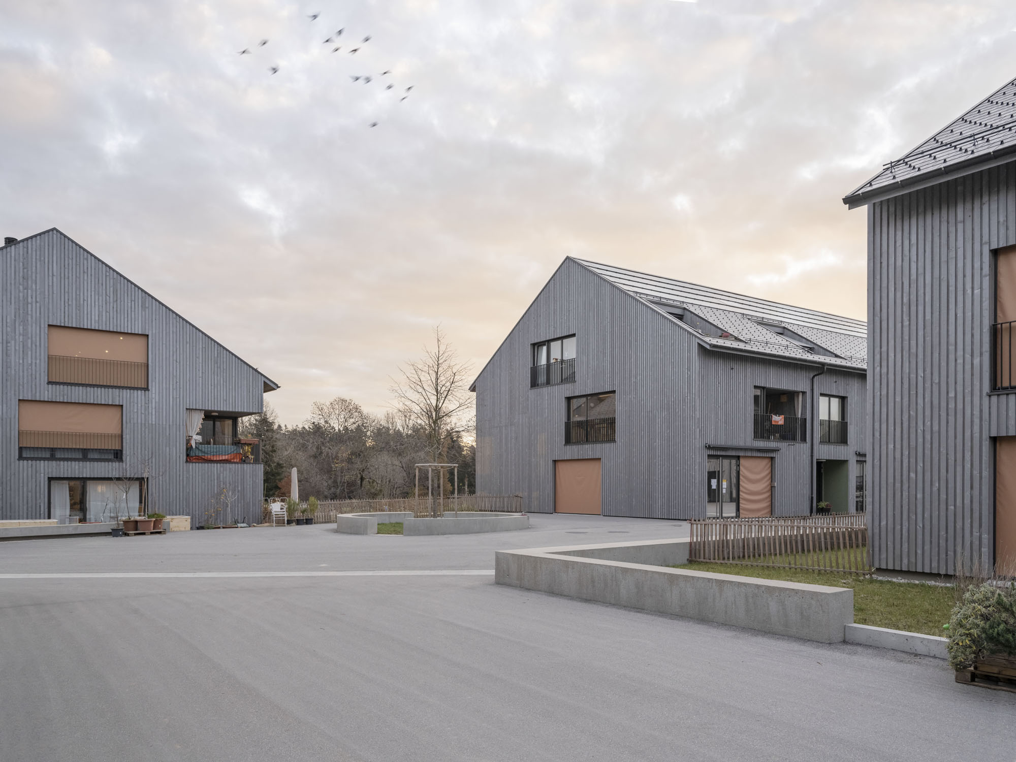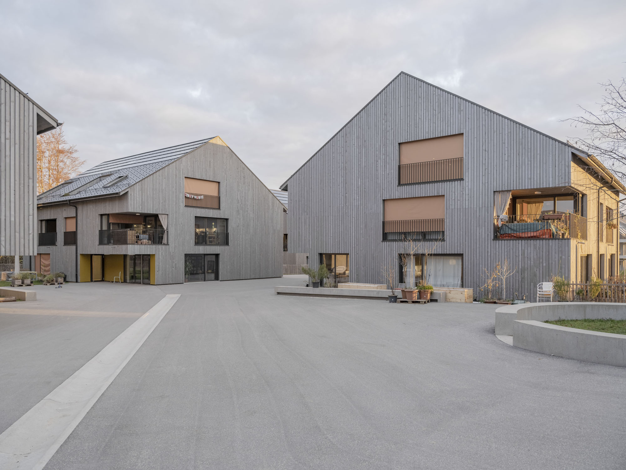 Le lotissement est situé dans le hameau de Pra Roman, qui culmine à 852 mètres d’altitude, dans les hauts de la commune de Lausanne. Les douze bâtiments abritant 85 logements sont regroupés en quatre ilots convergents vers une place centrale. Les arcades des rez-de-chaussée accueillent différents services: épicerie, salle commune, appui scolaire ou cabinet de physiothérapie. Matériau privilégié du projet, le bois est utilisé pour les planchers, les murs, les façades, les toitures, les revêtements de sol, ainsi que pour le chauffage et la préparation de l’eau chaude sanitaire. L’électricité est produite en toiture par des panneaux photovoltaïques, reliés à une batterie centrale pour obtenir une autoconsommation élevée. La mobilité douce et la gestion de l’eau ont également fait l’objet d’une grande attention lors de la conception du projet, à laquelle les usagers ont été associé.