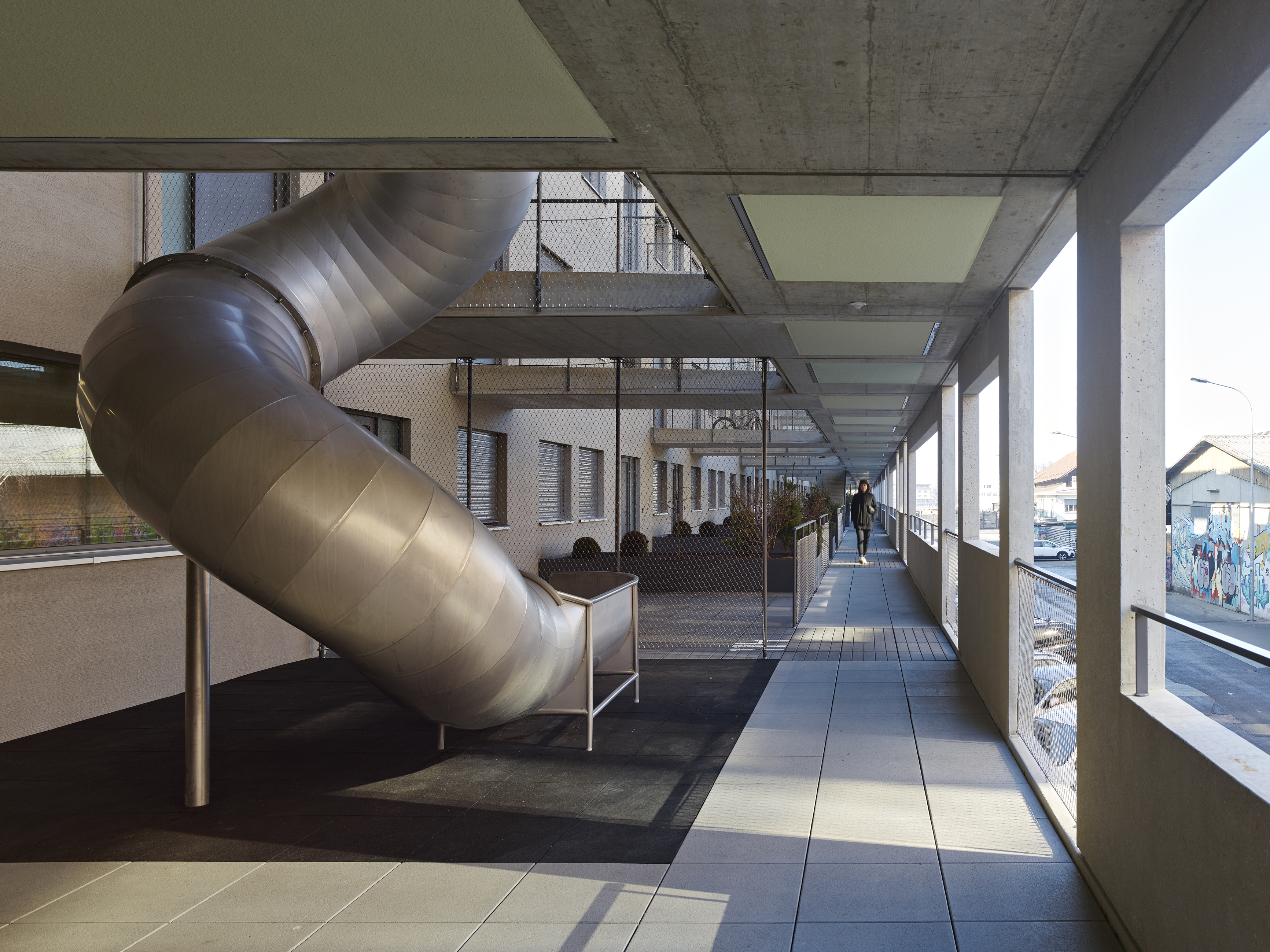 Situés sur une parcelle longiligne du centre de Lausanne, le nouveau bâtiment érigé par la société coopérative Logement idéal contribue à la requalification d’un ancien quartier industriel, ainsi qu’à sa mixité fonctionnelle et sociale. Le rez-de-chaussée est occupé par un centre de réinsertion et de restauration ainsi qu’un service administratif. Les quatre niveaux supérieurs accueillent 70 logements, du 2,5 au 4,5 pièces. Un exosquelette en béton préfabriqué sert de protection face aux nuisances de l’environnement urbain, et les appartements, qui bénéficient tous d’une typologie traversante et d’une généreuse terrasse individuelle au sud, sont distribués par des coursives aménageables au nord, qui intègrent des lieux de détente et de rencontre et des zones de jeux pour enfants. Le projet parvient ainsi à créer un habitat de qualité tout en respectant les limites de coûts induites par la production de logements subventionnés.