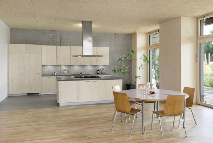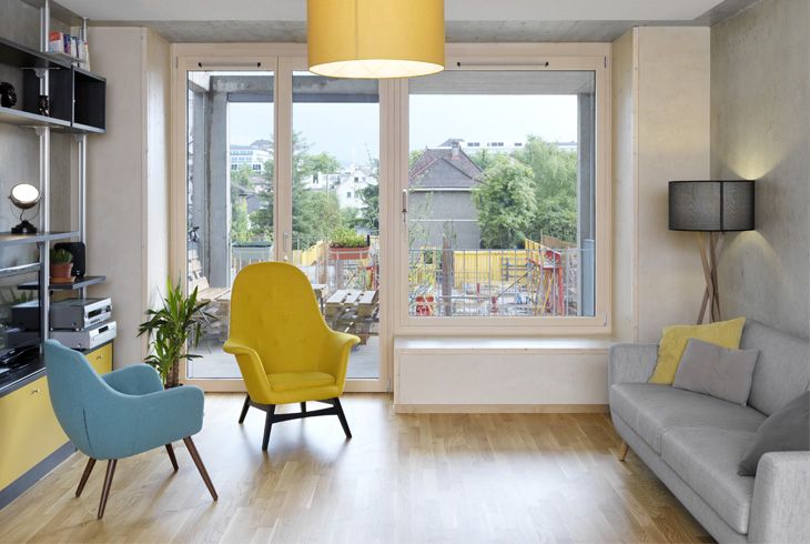 Le rez-de-chaussée abrite des ateliers et une salle commune avec cuisine et WC. Les trois montées verticales, dont seule la centrale est équipée d’un ascenseur, sont reliées horizontalement à partir de l’entrée centrale. Le 3e étage, sur lequel se trouvent la buanderie collective et les six chambres d’amis et chambres indépendantes à louer, est conçu comme une « rue intérieure » permettant les échanges et les rencontres. Le bâtiment répond aux critères les plus exigeants en matière d’écologie et de consommation d’énergie. L’utilisation de l’énergie active et passive du soleil et le recours à des matériaux sains et écologiques, de même qu’un parking réduit pour les voitures, ont constitué des axes de réflexion prioritaires lors de la planification du projet. Le traitement des eaux mérite d’être relevé : les eaux de pluie complétées par les eaux usées filtrées épurées servent à alimenter les chasses d’eau, assurant ainsi le principe d’un circuit fermé.