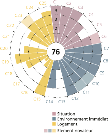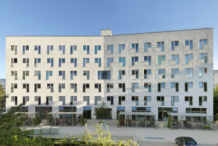 L’évaluation au moyen du SEL souligne en particulier l’intégration et la participation actives des (futurs) habitants au processus de planification et de construction (notamment en contribuant à l’isolation de la façade avec des bottes de paille). Une coursive relie les balcons de la façade sud et sert à la fois de liaison horizontale permettant, comme la « rue intérieure », de rejoindre l’ascenseur tout en proposant des liaisons physiques entre les habitants. De plus, un grand balcon devant chaque logement peut être séparé par un store pour devenir un lieu de séjour. Au sous-sol, plusieurs locaux servent à l’entreposage des fruits et des légumes, de cave à vin, mais aussi, entre autres utilisations possibles, au bricolage ou à la pratique de la musique. Ils sont complétés par des locaux de rangement pour les poussettes ou des fauteuils roulants.