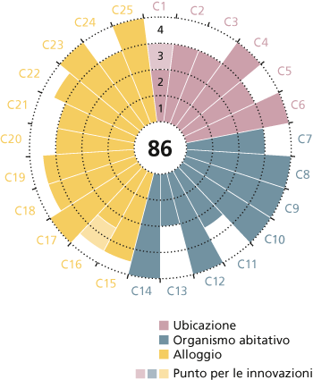 Tutti gli alloggi sono progettati tenendo conto delle esigenze della terza età. Grazie alle ampie logge ad angolo, l'edificio offre agli abitanti una vista diversificata sugli spazi esterni. La varietà volumetrica, il rapporto tra parti aperte e chiuse, i sottili dislivelli creati e la materialità data dall'involucro formato da listelli di larice posti in verticale, conferiscono all'opera una fisionomia precisa ed espressiva. Dalle logge si riconosce anche la struttura della costruzione massiccia. La compattezza, l'alto grado di isolamento termico e l'utilizzo di energie rinnovabili sono gli elementi chiave del concetto energetico. Un riscaldamento a pellet assicura calore e i pannelli solari garantiscono l'approvvigionamento di acqua calda. Gli edifici sono certificati Minergie-P-ECO (GR-004-P-ECO).