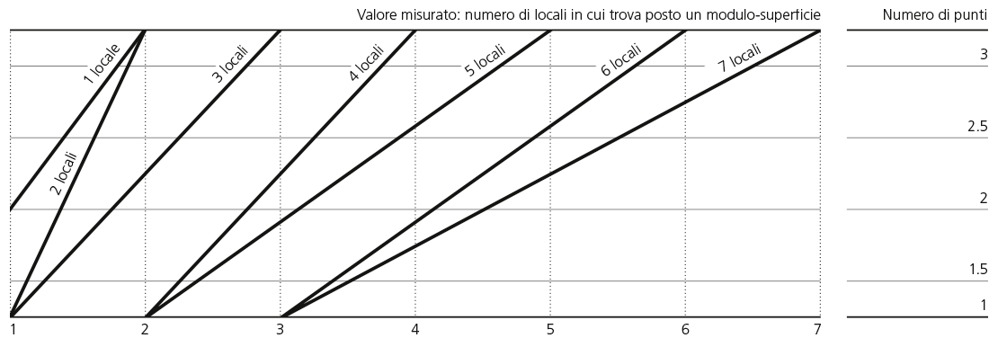 Come metro di misura per la valutazione quantitativa va utilizzato il modulo-superficie con i diversi utilizzi di base e gli esempi per la disposizione di mobilio. Si contano i locali in cui trova posto il modulo-superficie di 14 m² (lunghezza × larghezza da 380 × 368 cm a 467 × 300 cm). Un lato del modulo-superficie deve essere posizionato in corrispondenza di una parete lunga almeno 300 cm, priva di porte o finestre. Se il locale presenta una pianta irregolare, il modulo-superficie deve comunque poter essere posizionato con tutta la sua superficie rettangolare.