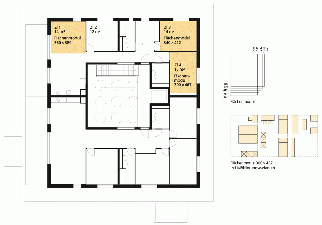 I locali utilizzabili in modo flessibile possono essere arredati in base alle varie esigenze. La flessibilità dell’utilizzazione va resa possibile non soltanto da fattori come le dimensioni e le proporzioni, ma anche da una disposizione intelligente dei vani delle porte e delle finestre di un locale.