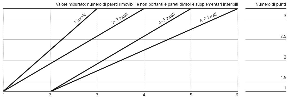 L’adattabilità è valutata a livello quantitativo in base al numero di pareti non portanti e rimovibili e/o alla possibilità di integrare pareti supplementari. Le pareti devono poter essere rimosse o inserite in un momento successivo, senza difficoltà dovute alla costruzione o alle installazioni, e devono essere lunghe almeno 250 cm. Ogni nuovo locale o parte di locale risultante dalla divisione deve essere provvisto di un accesso indipendente, avere una superficie di almeno 10 m², misurare almeno 270 cm sul lato più corto, ed essere illuminato e areato naturalmente. La dotazione di base va rispettata anche nell’alloggio modificato. Tutte le pareti rimovibili e non portanti e/o le pareti divisorie supplementari devono essere contrassegnate nei piani.
