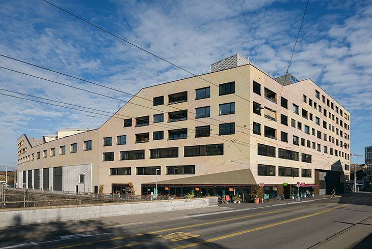 Il complesso di Kalkbreite è ubicato in posizione strategica dal punto di vista urbanistico, a cavallo tra due quartieri. Esso riunisce, in un’opera compatta e di ampio respiro, dotata di un’identità propria, una molteplice varietà di funzioni, offrendo alloggi, servizi e spazi commerciali.