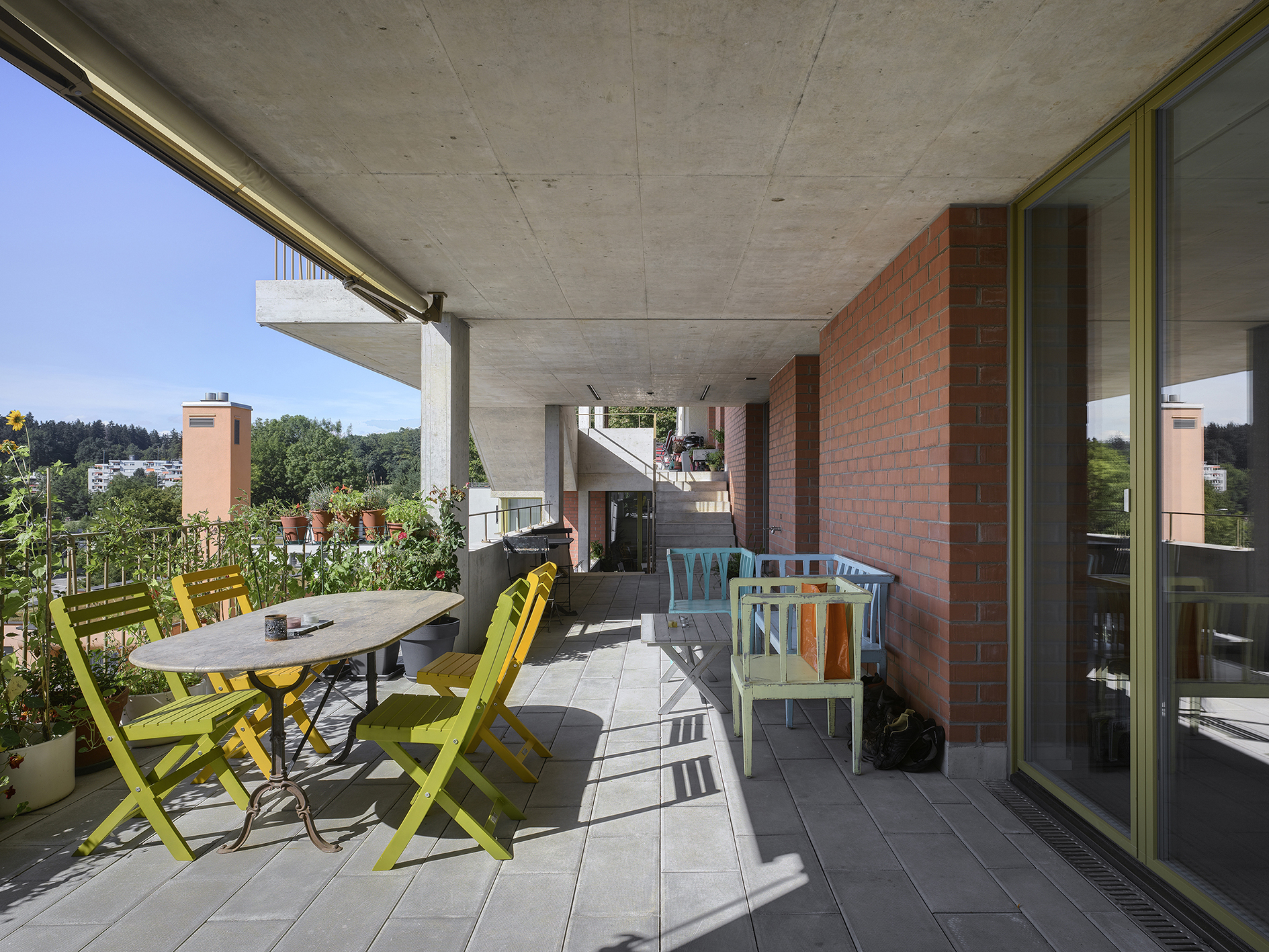 Gli edifici dell’ex studentato alla Regensdorferstrasse 190 e 194 vengono fusi in un unico nuovo complesso abitativo grazie all’aggiunta di un edificio intermedio; il risultato finale è armonioso e omogeneo. Una veranda a sette piani, accessibile a tutti i residenti, la cosiddetta «terrasse commune», collega verticalmente le abitazioni. Piccoli alloggi, appartamenti di tipo cluster e aree comuni polivalenti coesistono sotto lo stesso tetto, una configurazione che fa di Kraftwerk2 un luogo da abitare e vivere insieme.