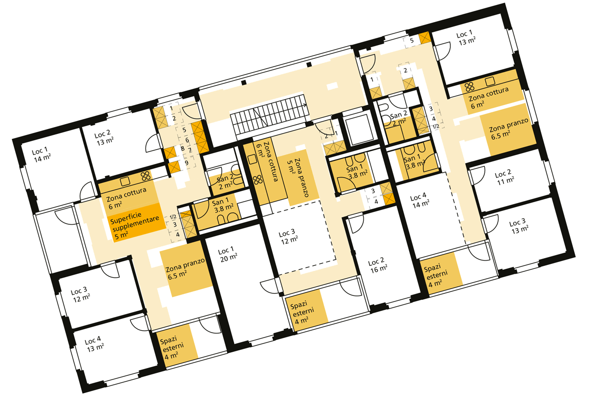 Dagli schemi risulta almeno in parte evidente come le superfici sono state inserite nei piani in vista della valutazione SVA. Per stabilire il numero di locali occorre attribuire fin dall’inizio alle singole stanze lo spazio di circolazione. Dopo aver definito le varie aree di utilità (zona cottura, zona pranzo) si può accertare se ci siano ulteriori superfici disponibili (da considerare come mezzi locali) e secondo quali criteri permettano l’attribuzione di punti supplementari.