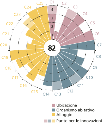 Per il confronto si contestualizza il valore d’uso ottenuto. La valutazione, rappresentata mediante un grafico sinottico (schema del ragno), illustra i tre ambiti: ubicazione dell’organismo abitativo, organismo abitativo e alloggio, nonché i singoli criteri C1–C25 e i punti per le innovazioni, nelle rispettive corrispondenze. Inoltre i valori d’uso calcolati possono essere messi a confronto con altre abitazioni, in base ad alcuni esempi di valutazione messi a disposizione online.