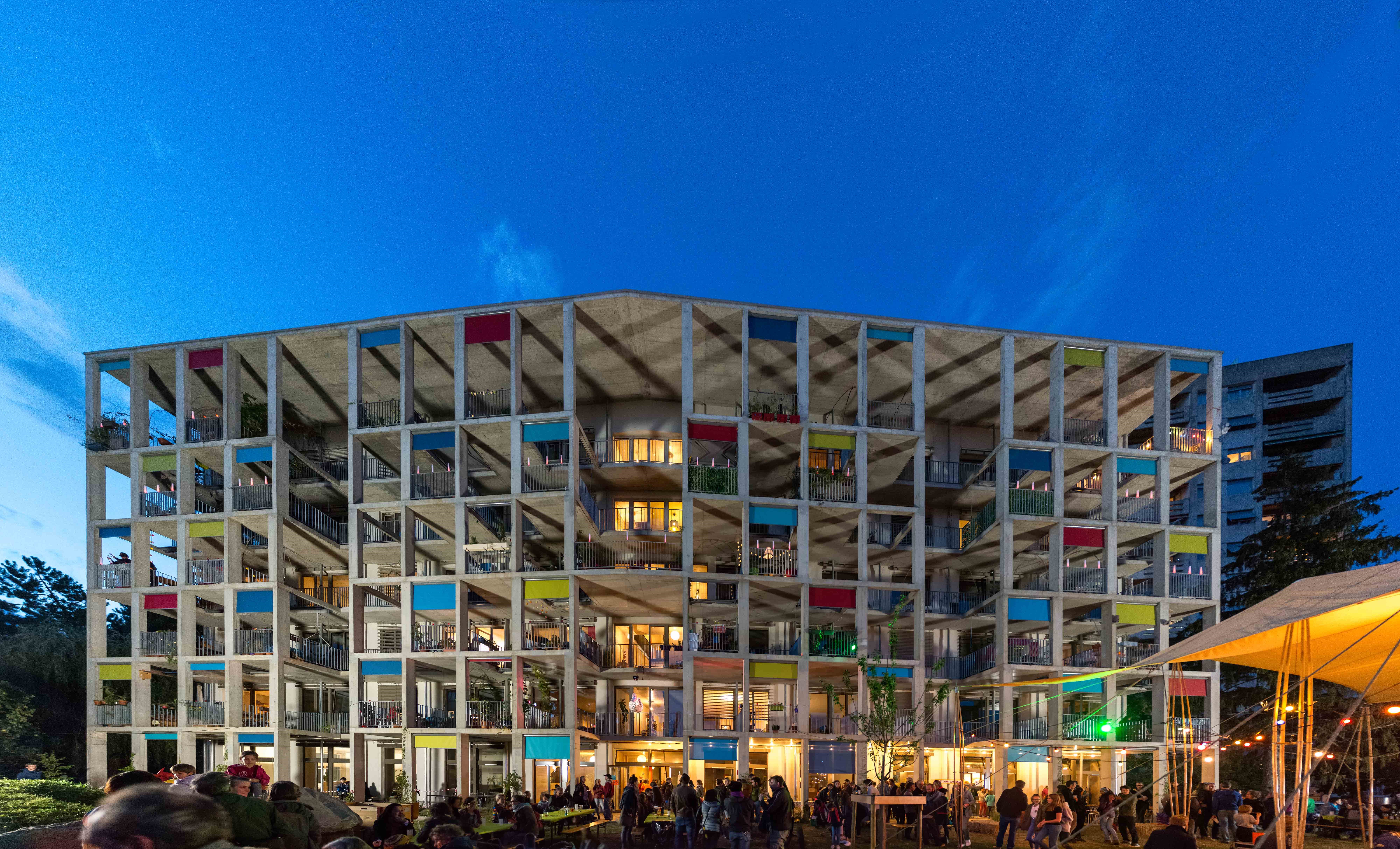 Entrambe le facciate principali della struttura nel quartiere Charmilles sono state isolate con balle di paglia. Anche i soci delle cooperative hanno contribuito attivamente al progetto. L’edificio commissionato da Luciole ed Equilibre dispone di numerosi spazi d’incontro e aree comuni: una terrazza sul tetto con giardini pensili, due locali di uso comune e camere per gli ospiti. In fase di progettazione si è puntato molto sull’interazione sociale, come dimostrano i balconi su ciascun piano collegati gli uni agli altri e che permettono alle persone a mobilità ridotta di accedere alle abitazioni.