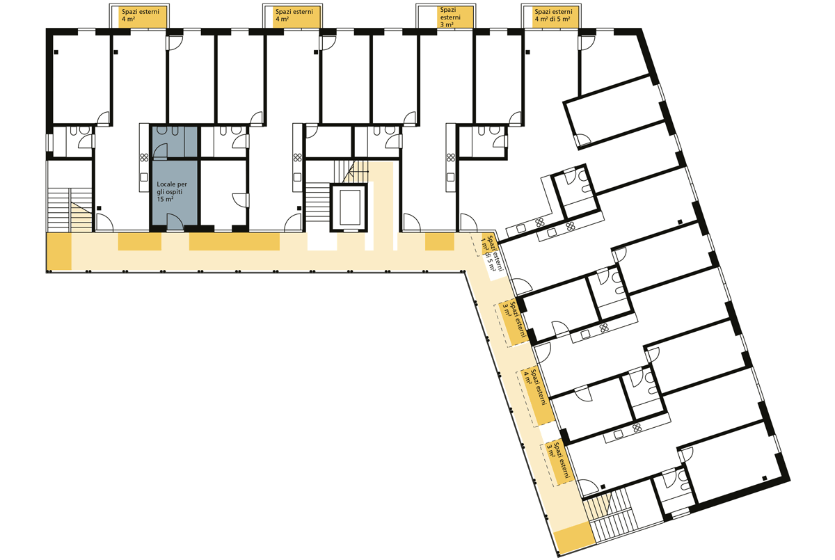 Il piano rialzato della parte centrale della corte interna, a cui si accede mediante un’ampia scalinata, è uno spazio aperto in cui si trova l’ingresso coperto, con i citofoni e l’ascensore, da cui si può raggiungere la loggia e la cucina (spazi comuni) e la lavanderia. Le balconate conducono ai diversi appartamenti e alle scale di sicurezza poste alle estremità di entrambe le ali dell’edificio, da cui si può arrivare alla terrazza sul tetto (spazio comune). Altri spazi comuni si trovano ai vari piani dell’edificio: un locale per gli ospiti, uno per la musica e un’officina. I 33 appartamenti sono stati progettati e realizzati tenendo conto delle esigenze di contenimento dei costi.