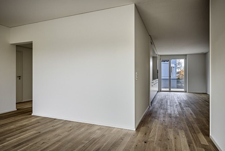 I balconi aggettanti e incassati fanno sì che gli appartamenti possano beneficiare costantemente di un orientamento Est-Ovest. La loro disposizione è concepita in maniera compatta ed efficiente. Al limite esterno del complesso si trova, al piano terra, un locale comune provvisto di WC.
